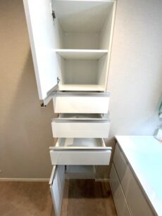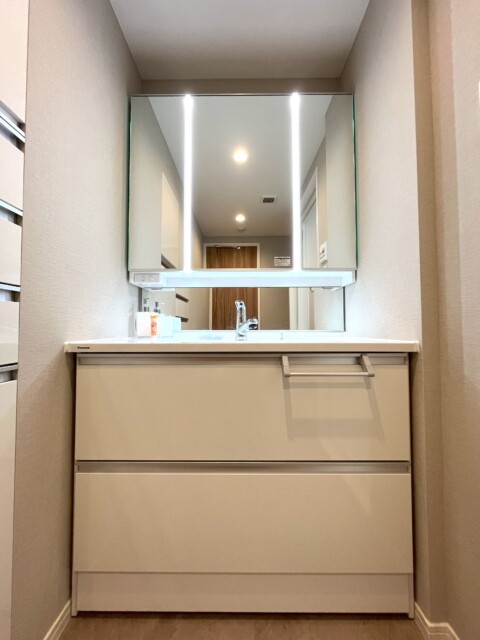洗面化粧台は身だしなみを整えるのに便利な三面鏡付き。裏がキャビネットになっているので、洗面周りに散らかりがちな細々したものもスッキリと片付けることができますよ。