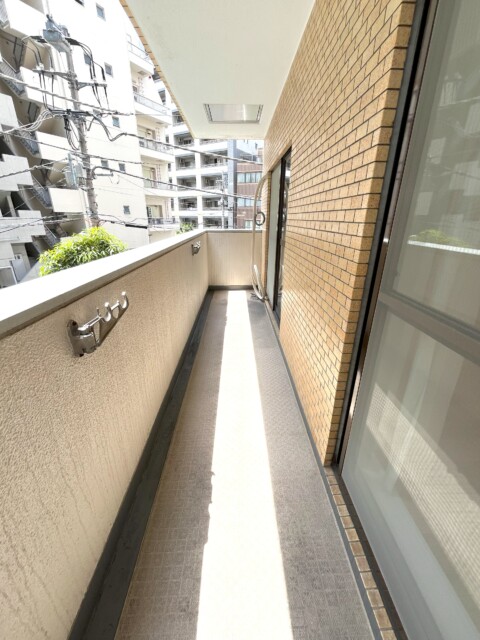 広さ7.80㎡、南向き。LDKと洋室3のどちらからでも出られるバルコニーです。洗濯金具が付いているので、竿だけ用意すればお洗濯物を干すことも出来そうですね。