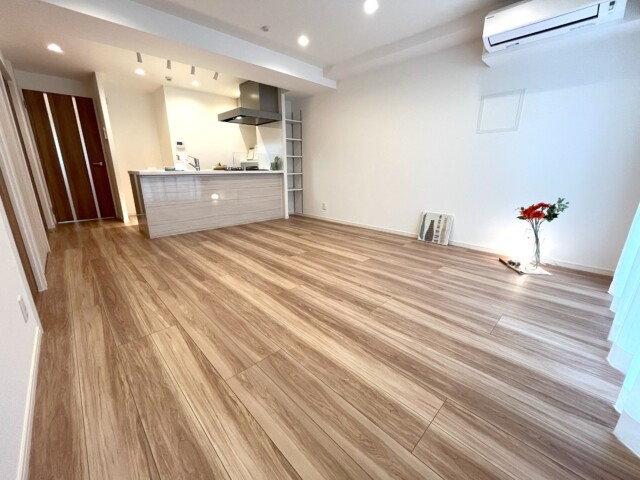 こちらは約15.4帖のリビング・ダイニング・キッチン。手前からキッチン、ダイニング、リビングとなる縦長のお部屋です。カウンターキッチンからはリビングダイニングが見渡せるので、お料理中でもご家族との会話が弾みますよ。