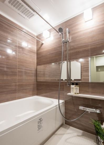 浴室はブラウンの落ち着いた雰囲気。追い焚き機能や浴室乾燥機などの便利機能も漏れなく完備していますよ。