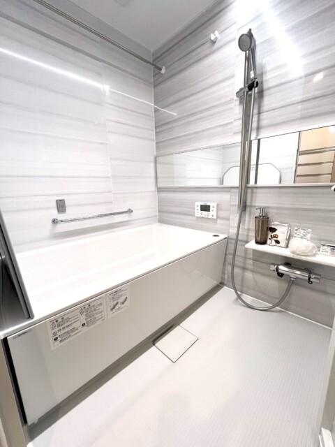 浴室はモノトーンでまとめられた明るい雰囲気。ゆったりと湯舟に浸かれば一日の疲れも洗い流せそうですね♬ 追い焚き機能が付いているので長湯をしてもお湯が冷める心配もありません。