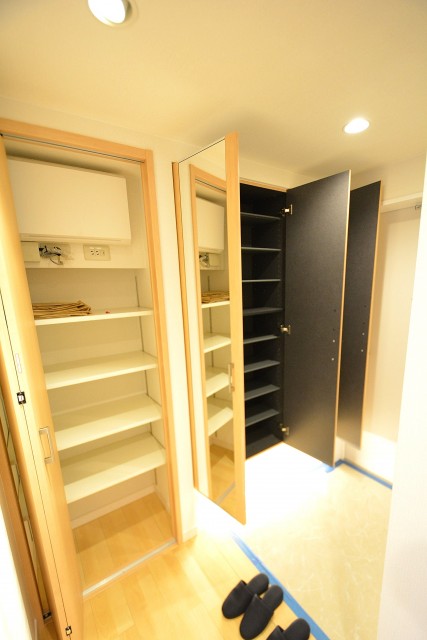 玄関入り右手に、全身鏡付き、たっぷり収納できるシューズBOXあり