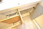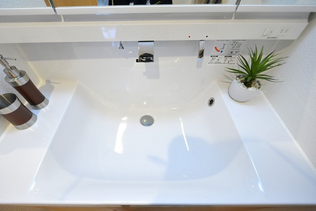 ナチュラルな色の洗面台。三面鏡