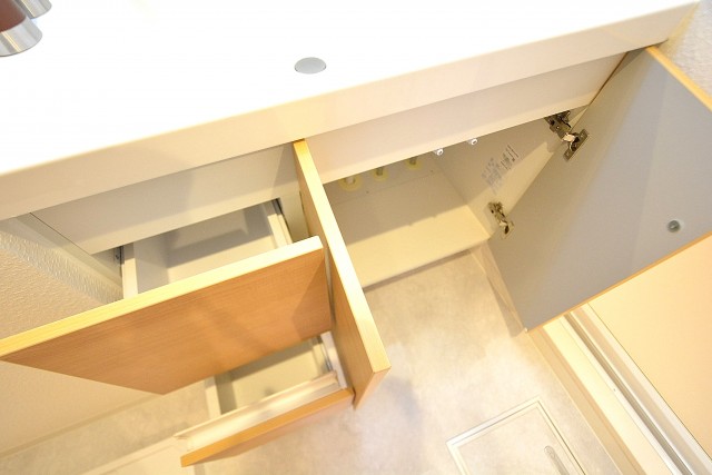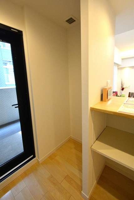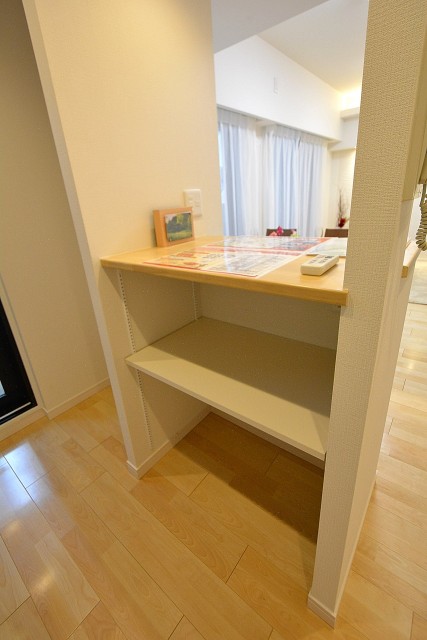 上下にたっぷり収納スペースあり。キッチン横に棚あり