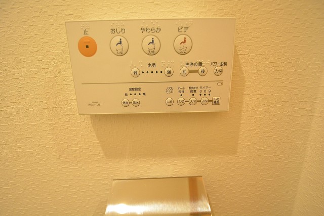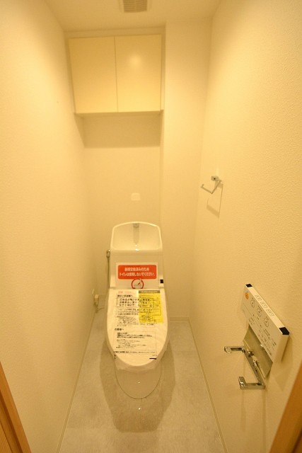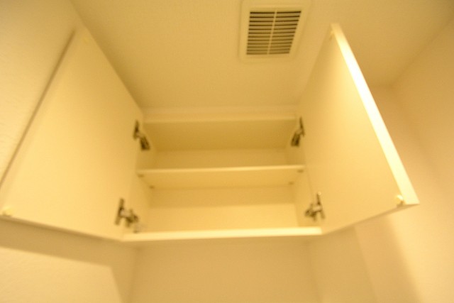 ウォシュレット機能付きトイレ。上に2段式の収納スペースもあるので