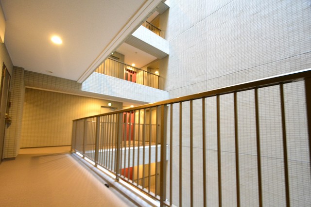共用廊下 上が吹抜けになっているので廊下も明るい雰囲気になっています。