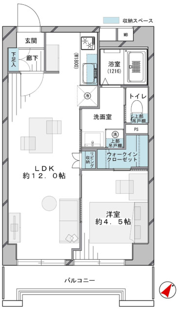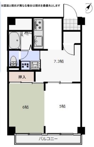 南西向きバルコニーに向かって細長く伸びたよくあるタイプのお部屋ですが、カウンターキッチンでなく壁付けキッチンにすることによって、リビングダイニングを広くとることが出来るようになっています。