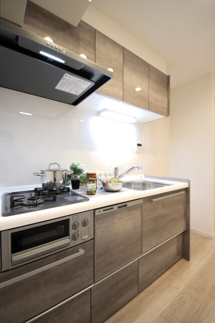 キッチンは省スペースの壁付けタイプ。少し奥まった所に横向きで設置されているので、リビングダイニングにむき出しで置かれているような感じもありません。幅1800cmの調理台には、食器洗浄乾燥機や浄水機能一体型水栓などの家事アシスト機能も充実しています。