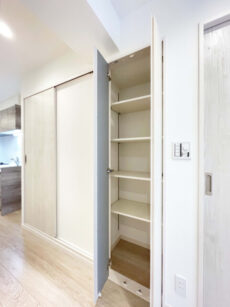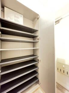 貴重なお部屋のスペースを居室や収納に充てられるよう、玄関・廊下はややコンパクト。玄関が靴で溢れないようシューズボックスは収納力のあるトールタイプになっています。棚の高さが調節が可能なので、ヒールやブーツなどの背の高い靴でもキレイに収納出来ますよ。