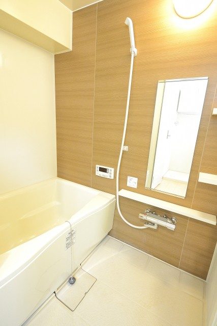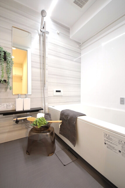 浴室は白を基調にモノトーンでコーディネイトされた明るい雰囲気。ダークトーンの落ち着いた浴室もいいですが、個人的には明るい方が好みです。浴室換気乾燥機付きなのでお天気なんか気にせず洗濯機を回すことが出来ますよ。