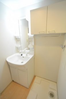 洗面室には洗面化粧台の他に、洗濯機スペース、トイレ、浴室がまとまっていて脱衣所も兼ねています。洗面化粧台は三面鏡付き。裏がキャビネットになっているので洗面周りの細々としたものもスッキリと収まりますよ。洗濯洗剤などのランドリー用品は洗濯機スペースの吊戸棚にどうぞ。