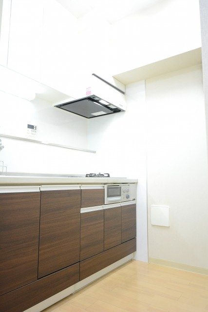 茶色いシステムキッチンって白い壁紙と本当にあいますよね~