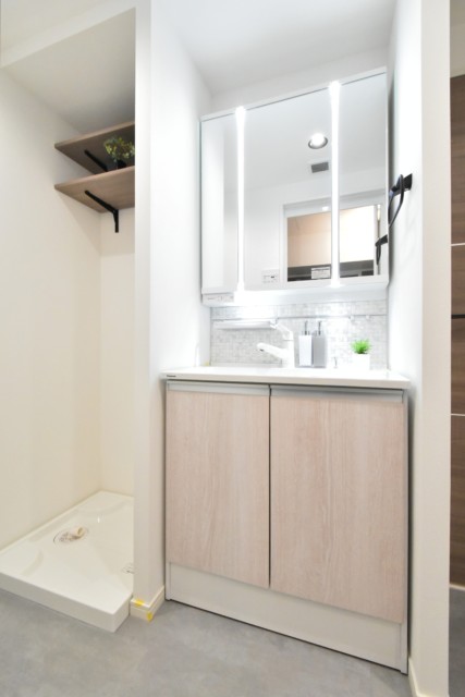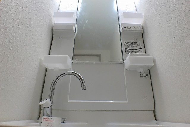 洗面台は三面鏡付き。鏡の間に付いた照明のおかげで、鏡を見る時に影になる心配もありません。間とは!LED出現のおかげですね(^^)