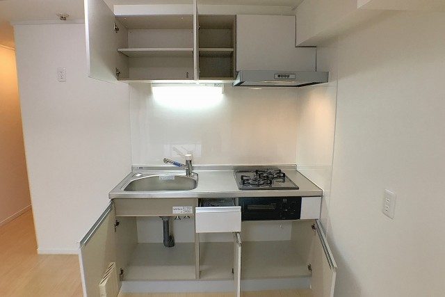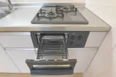 コンロは2口、グリルも付いています。ついつい忘れがちな換気扇ですが、調理中は換気扇をお忘れなく!少し前から回し始めると効果的らしいですよ。