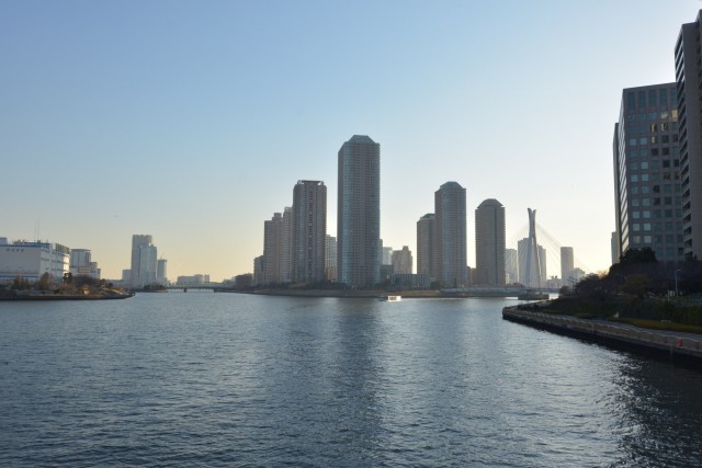 中央のマンション群は佃のリバーシティで大型スーパーマーケットなどもあり、