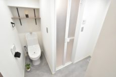 扉の無い開放的なトイレ。気になる方はカーテンなどを付けるのもアリかもしれませんね。トイレットペーパーなどのストックに便利な棚が付いています。洗浄便座はTOTO製のウォシュレット。