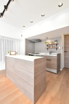 壁付けタイプのキッチンにはカウンターが造り付けになっていて、パッと見はⅡ型のカウンターキッチンのよう。収納や作業スペースを増やすと共に、生活感の出やすいキッチン内が目立たないようにしています。グっと高級感が増しますよね。