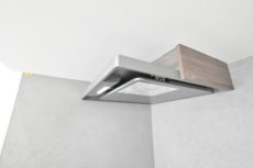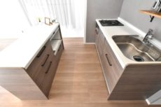 ナチュラルなお部屋の雰囲気に合わせた、木目パネルの調理台。