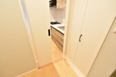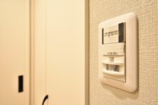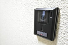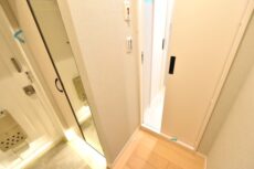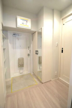 玄関ドア横にはモニター付きインターホンが設置されていて、お部屋の中から訪問者を確認する事が出来ます。返事をする前にチェック出来るのがいいですよね。ドアスコープもありますが、息を殺して覗く感じが苦手です^^;)