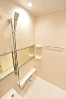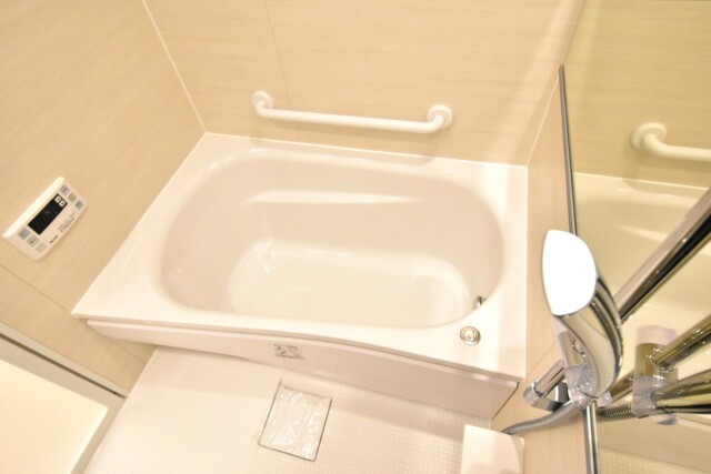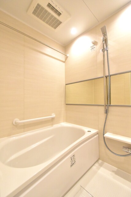 浴室は温かみのある色合いでリラックスしたバスタイムを過ごせそうですね。浴室換気乾燥機が付いているので、お天気を気にせず洗濯機を回すことが出来ますよ。