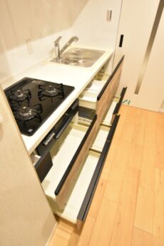 収納はスライドキャビネットと吊戸棚。引き出しタイプのスライドキャビネットは出し入れがし易く、たくさん詰めても中の確認がしやすい優れものです。