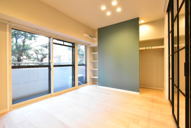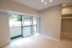 こちらは約6.2帖の洋室。南西向きバルコニーに面したお部屋です。収納はオープンシェルフとクローゼット。クローゼットは半分オープンになった個性的な形です。風通しが良く、湿気が籠ったりしないのがいいですね。収納力もありそうです。