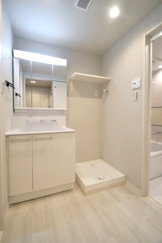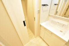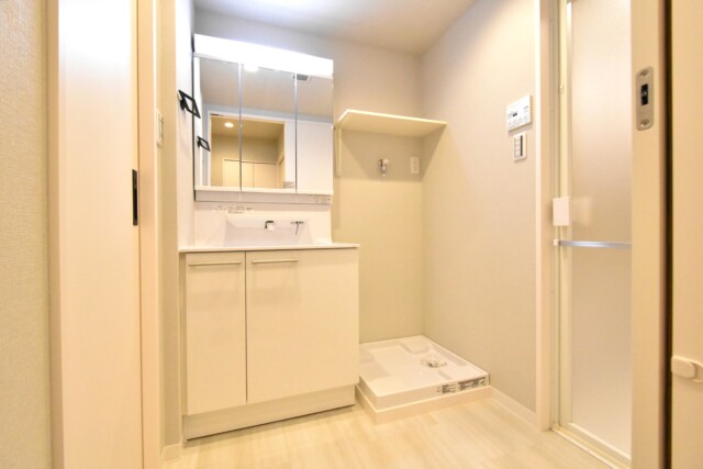 洗面室には洗面化粧台の他に洗濯機スペースと浴室、トイレがまとまっていて脱衣所も兼ねています。洗濯機スペース上部には棚が付いているので、洗濯洗剤や洗濯ネットなどのランドリー用品はこちらへどうぞ。