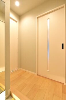 玄関周りにはトールタイプのシューズボックスをはじめ、収納棚や物入など収納が豊富。棚は扉のないオープンタイプなので、収納に使うなら洒落たカゴなどを使うといいかもしれませんね。玄関照明は自動的に照明のONOFFをしてくれる人感センサー付きです。