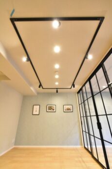 ピクチャーレールが付いていると「せっかくだから絵でも飾ってみようかな?」なんて気になりますよね。天井に四角く設置されたダクトレールはお洒落なのは勿論のこと、簡単に照明の位置や種類を変えられるのでレイアウトの自由度がグッと上がりますよ。