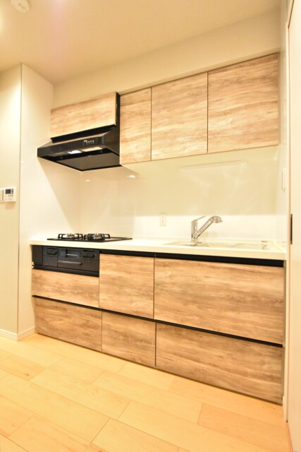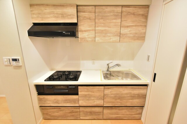 キッチンは壁付けタイプ。場所をとらずにお部屋を広く使うことが出来ます。ただし、キッチン内が目立つので頑張って綺麗に保ちましょう!