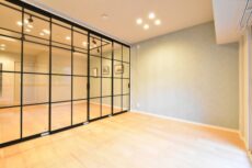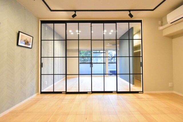 LDKには窓が付いていませんが、洋室との間はガラス扉で仕切られているので開けても閉めてもバルコニーからの光が入って来ます。逆にプライバシーが欲しい時はロールスクリーンやカーテンを設置したり、衝立などを置いたりが必要ってことですね。