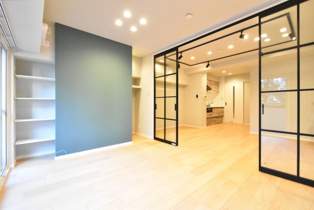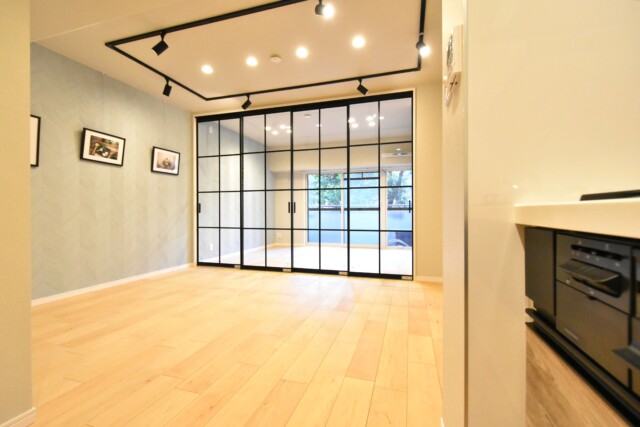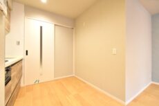 こちらは約10.8帖のリビング・ダイニング・キッチン。窓はありませんが、ガラス扉のおかげで南西向きのバルコニーからの光が入って明るいお部屋になっています。ほぼ素通しなので見た目は約17帖!広く感じるわけですね(^^)