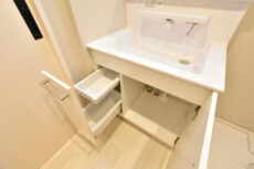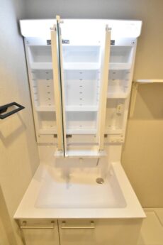 洗面台は三面鏡付き。裏はキャビネットになっています。細々した物が多くなりがちな洗面廻りには豊富な収納が有り難いですね。大きな物から細かい物までバランスよく収まりそうです。