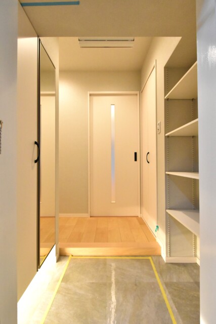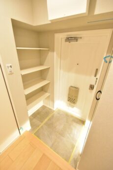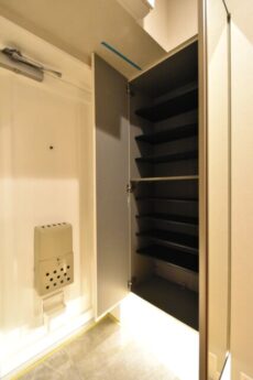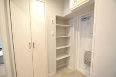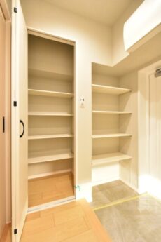 玄関周りには収納がたくさん!トールタイプのシューズボックスをはじめ、扉付きの物入やオープンの収納棚などが並んでいます。特に扉付きの物入は奥行きが深く、棚の手前に長物を入れることも可能ですよ。