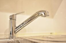 ビルドインの水栓は、引き出すとヘッドが伸びて洗面ボウルを流したりに便利です。