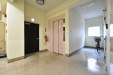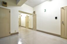 エレベーターで3階まで。内廊下に並ぶ玄関のひとつが今回お邪魔するお部屋です。廊下に自転車などが置いてありましたが、ダメな所もあるので大丈夫かは事前に確認した方が良いと思います。