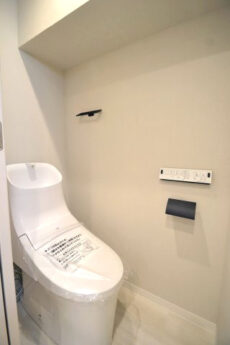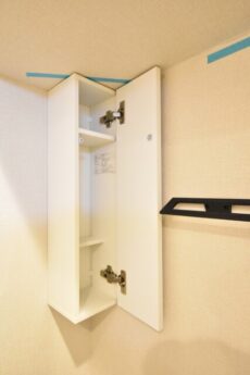 トイレットペーパーなどのストックに便利な吊戸棚も付いています。縦型は出し入れしやすくていいですよね。洗浄便座はTOTO製のウォシュレット。