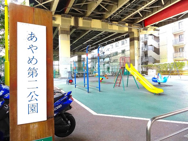 マンションまでは水天宮前駅からほぼ1本道。首都高の下の通りを歩いていけば到着します。途中にカラフルな遊具満載の公園も。この日は遊んでおらず、少しさみしい感じです(>_<)