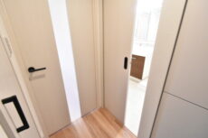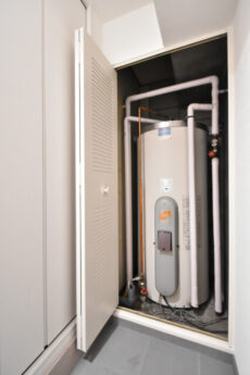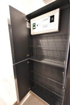 玄関内には扉が二つあり、左側はシューズボックスになっています。靴を入れるには十分過ぎる奥行があり棚も可動式。ブーツやヒールなどでもスッキリ収納可能ですよ。右側は・・・!!!電気温水器ですね。時々見かけますがなぜかいつもちょっとビックリさせられます(^-^;