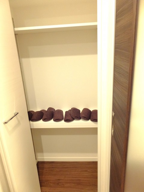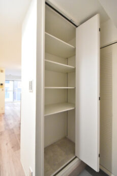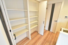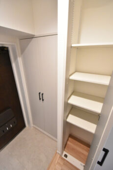 入ってすぐ右側には幅のある収納棚。奥行はあまりありませんが、中身を一目で確認できるこのタイプは食品や日用品のストックに最適ですよ。