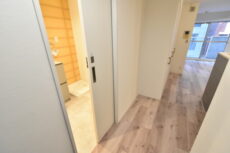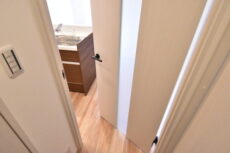 玄関ホールや廊下などがなく、戸口から突き当りのバルコニーまでが見通せるワンルームのようなタイプ。多少クランク状になっていて視線を遮っていますが、宅急便やフードデリバリーなどの使用頻度も増えている昨今、衝立などがあると安心かもしれません。