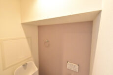 洗面台の対面にはトイレがありました。上部に吊り棚があるので、掃除道具、ストックをしまえてトイレをスッキリ使えますね!(^^)!