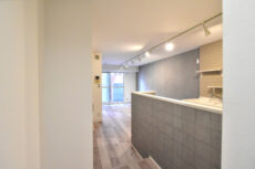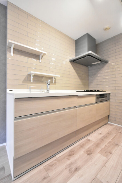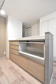 調理台はフローリングからワントーン濃いめの木目調。お部屋の中でアクセントの役割も果たしています。コンロ前にはしっかりとした天井までのパネルが設置され、リビングダイニングへの油跳ねの心配もありません。そのせいもあって先程も触れたように解放感は今ひとつ。とは言え、シンク前に立てばカウンターキッチンらしい眺めが望めますよ。