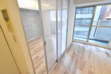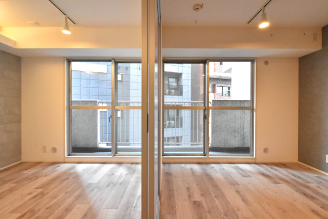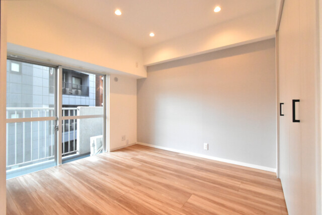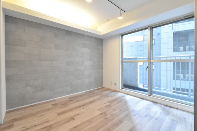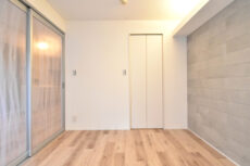 LDKと同じ南東向きバルコニーに面したお部屋です。一面がアクセントウォールになっていますが、無地の薄いグレーと控えめなのでインテリアの邪魔をすることもありません。