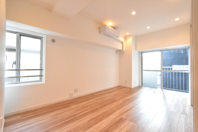 南東向きバルコニーに面した二面採光のお部屋です。明るさだけでなく風通しも良さそうですね。シンプルな色使いなので家具やカーテンなどのインテリアも合わせやすく、好みのイメージに変えていく楽しみがあります。