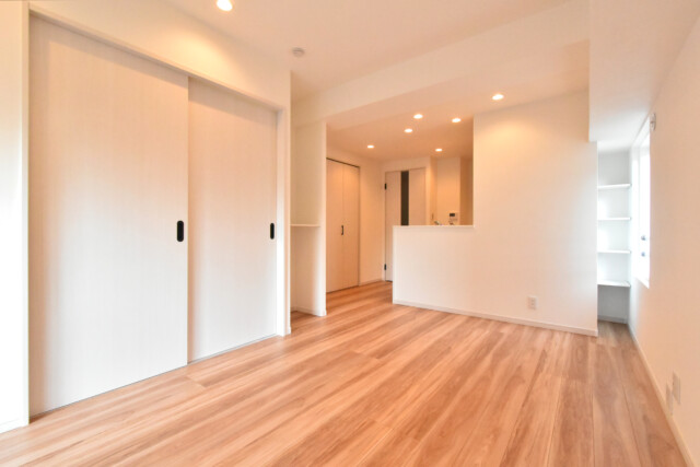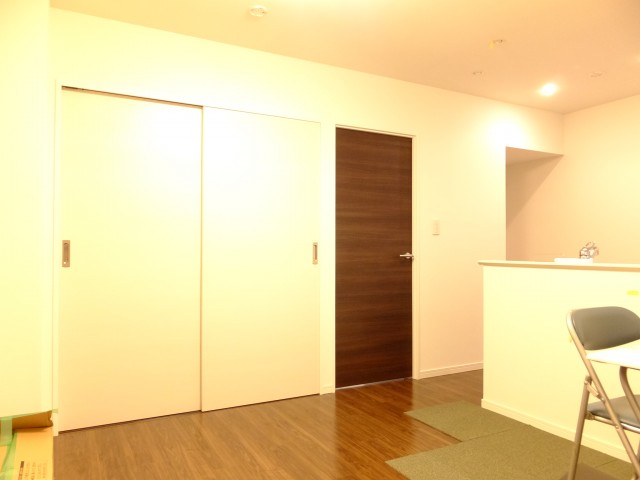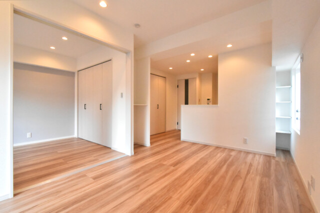 もう一つのドアは引戸になっていて、開けると5.2帖の洋室が広がります。こちらには収納スペースがありませんが、引戸を開けたままにしておけば、この部屋をリビング代わりにお使いいただく事も出来ますよ☆