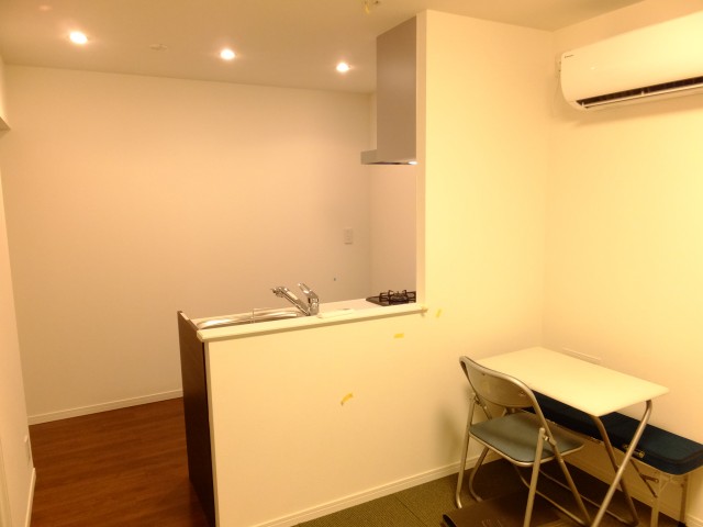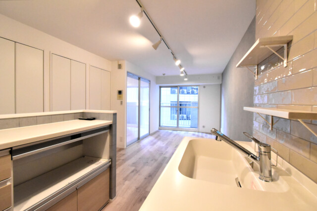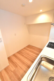 南東向きバルコニーに面したお部屋です。キッチンは横向きですが、縦長でキッチン→ダイニング→リビングと並べて使うオーソドックスなタイプ。家具のレイアウトはしやすそうですね。