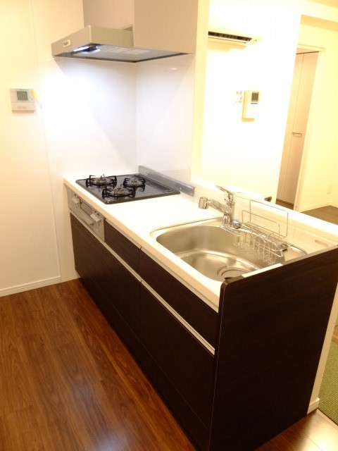 コンロは3口、グリル付。温度設定やタイマー機能の付いた賢いコンロです。IHなんかだとイメージしやすいのですが、ガスでもこんなことできるんですね(*^^*)