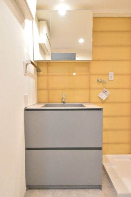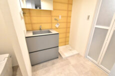 洗面化粧台はスッキリとしたフォルムのミニマルタイプ。直線で構成され、モノトーンでまとめられたシャープな印象の洗面化粧台です。
