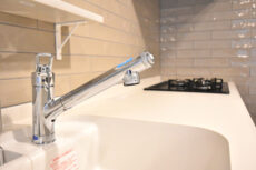水洗は浄水機能一体型ハンドシャワータイプ。ノズルが伸びて大きい鍋やシンクを洗うのに便利です。お料理中は換気扇を忘れずに!